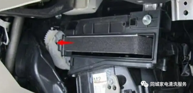 3、首先把去年自己装的空调滤芯拆下来,拆下来以后还要把那个白色盖子盖好,不然清洁剂会从缝隙处渗出来。拆开下图中红框位置的塑料卡套,一共有5颗,下图红框位置显示了其中三颗。
