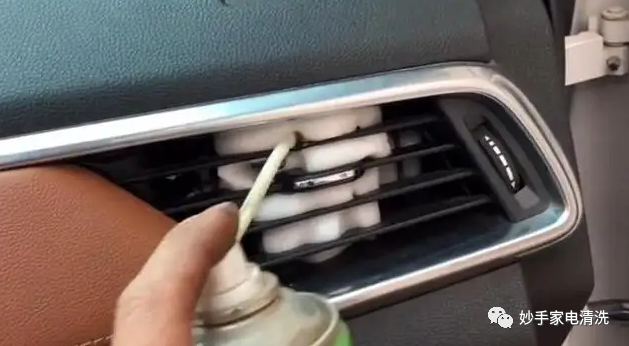 3、开始清洗,点火,关掉AC,用外循环,最大的4档风量,记得风要对着驾驶员吹(就是不要向着脚吹),然后给清洗剂插上导管用力摇,对着副驾前方的进风口。喷进泡沫,此时注意出风口处喷出泡沫,用布随时准备擦干泡沫。